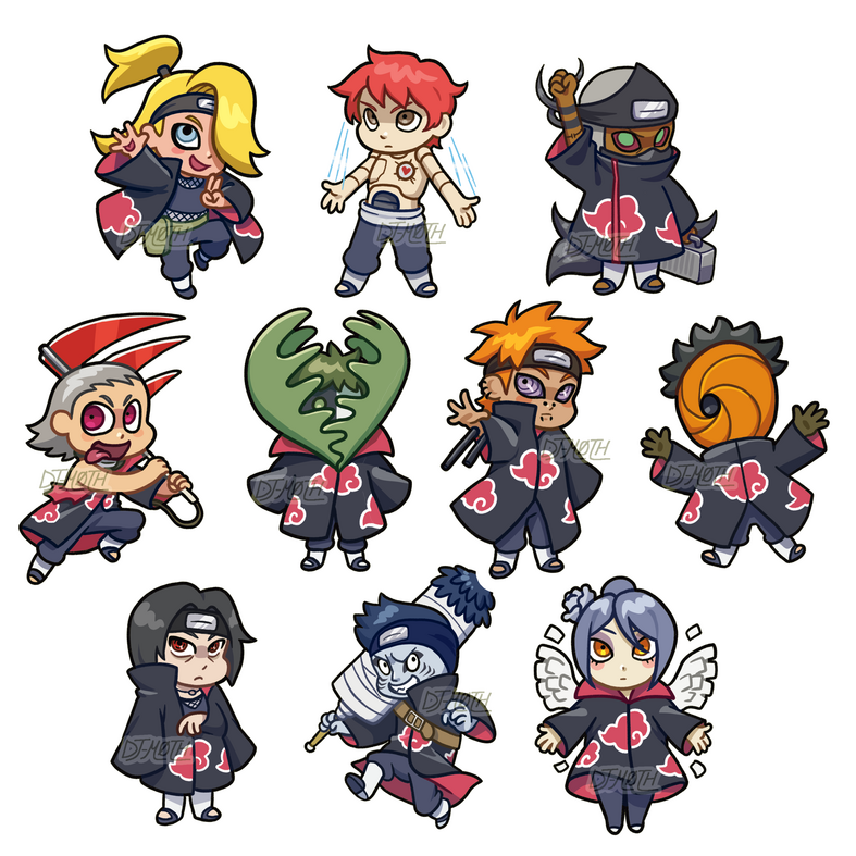 | Deidara | Sasori | Hidan | Kakuzu | Itachi | Kisame | Pain | Konan | Tobi | Zetsu |