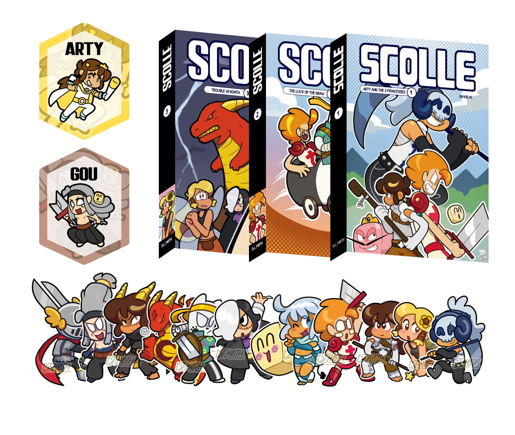 Buy the entirety of the Scolle collection with a 15% discount.This pack includes Volumes 1, 2 and 3 of Scolle, alongside their sticker packs, as well as the Arty and Goultard enamel pins.