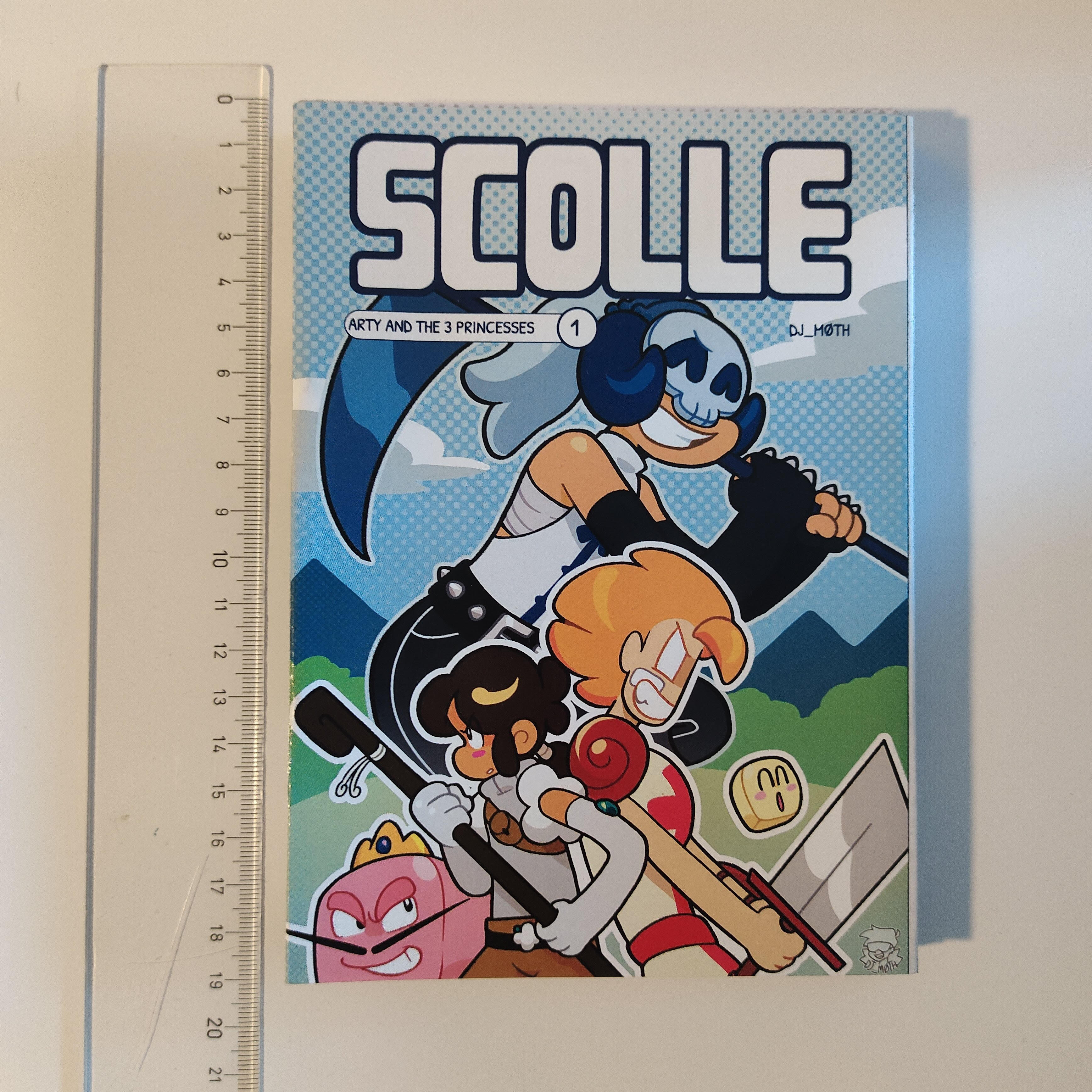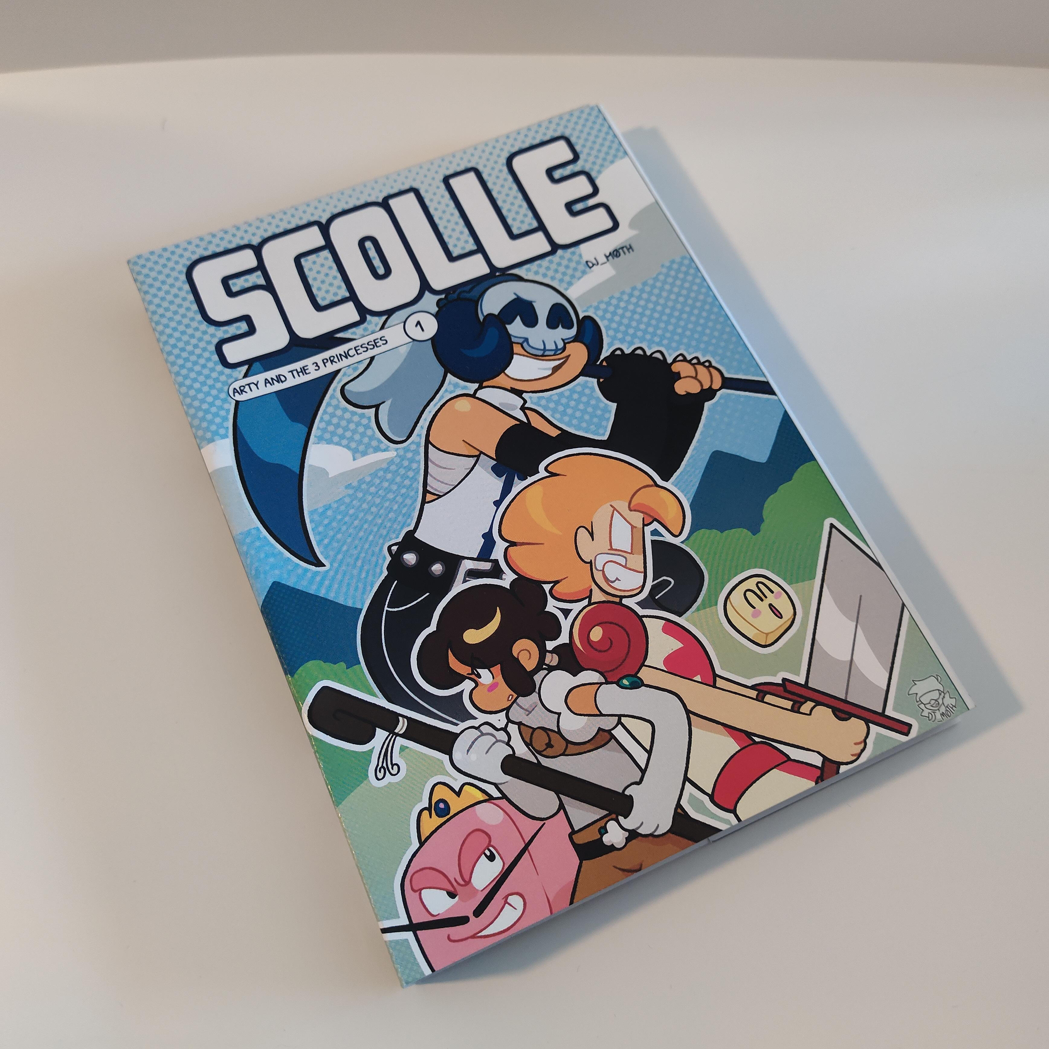 The physical edition of all existing Scolle volumes, their respective stickers, and other Scolle merch. This pack includes volumes 1 to 3 of Scolle, all the sticker packs, the Arty enamel pin and the Goultard enamel pin, all with a 15% discount.Everything is handmade please excuse possible small flaws. If there is no existing stock, the order will be made within 10 days of the purchase.Available in English, Spanish and French (translated by @bitterpanacea on Twitter.)Approximate weight: 730g
