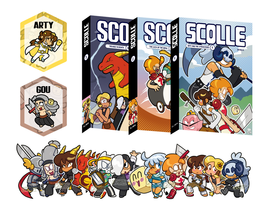 The physical edition of all existing Scolle volumes, their respective stickers, and other Scolle merch. This pack includes volumes 1 to 3 of Scolle, all the sticker packs, the Arty enamel pin and the Goultard enamel pin, all with a 15% discount.Everything is handmade please excuse possible small flaws. If there is no existing stock, the order will be made within 10 days of the purchase.FRENCH version translated by @bitterpanacea on Twitter.
